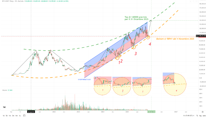 Nel caso più recente, l’osservazione dei quattro minimi principali (“bottom”) ha mostrato un’elevata analogia tra il bottom n.3 e quello attuale (n.4): entrambi caratterizzati da RSI bassi (33–38), volumi in compressione e integrità della struttura rialzista. Questo pattern, se confermato, rappresenta un esempio significativo di comportamento ciclico di stabilizzazione, utile come riferimento metodologico nella modellazione predittiva di sistemi complessi.